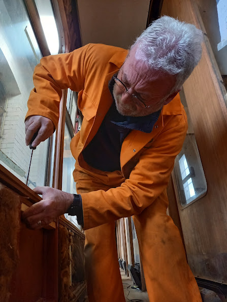 In the north vestibule Robert is sanding down more of the veneer panelling. A huge amount of effort has gone into doing this throughout the coach - are we nearing the end?