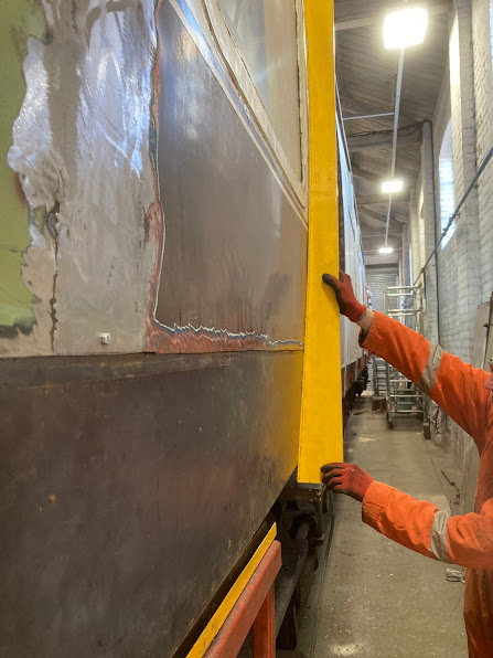 Another leap in the refurbishment of 1675 as the first of the new skirt sections goes on. The coach body profile is being checked.