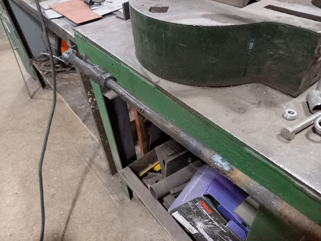 I had quite an interesting chat with him as to how this was being done. In effect this is known as a root weld, the upper photo showing the first one completed and the bar still hot, the lower photo repairing the second break, where the metal will be built up. The weld will be stronger than the original metal.
