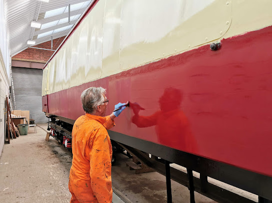 Then on to the first coat of Crimson on the Malvern side south end large panel. George's first job was top coating the new footboards which are to replace the rotten ones found on the 4th Rake coaches.