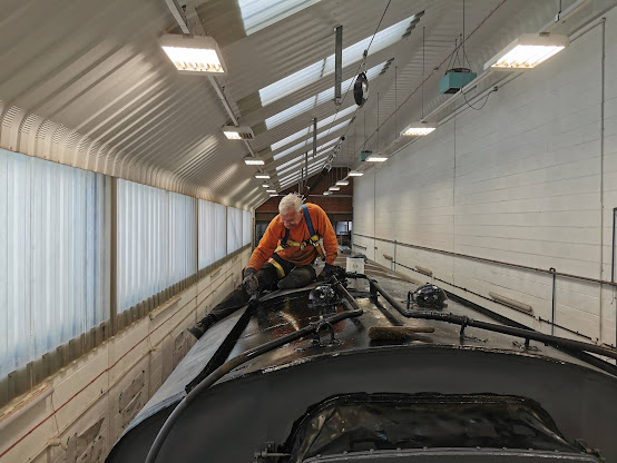 Speaking of roofs, I climbed up a helpfully placed scaffold tower to get a picture of Bob in the harness on the SK painting the roof.