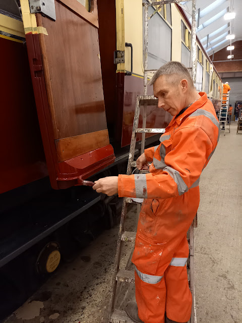 Bob and I removed all the line tapes and then began repairing the lines where required, initially doing the yellow band.[Photo : Paul E.] On both sides of the coach all the yellow band was repaired and the black where possible.
